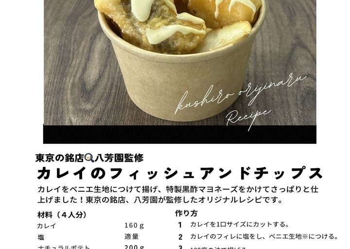 第1弾の投稿は、東京都白金台の銘店「八芳園」の監修レシピ、「カレイのフィッシュアンドチップス」、「つぶのブルゴーニュバター和え」、「イワシ...