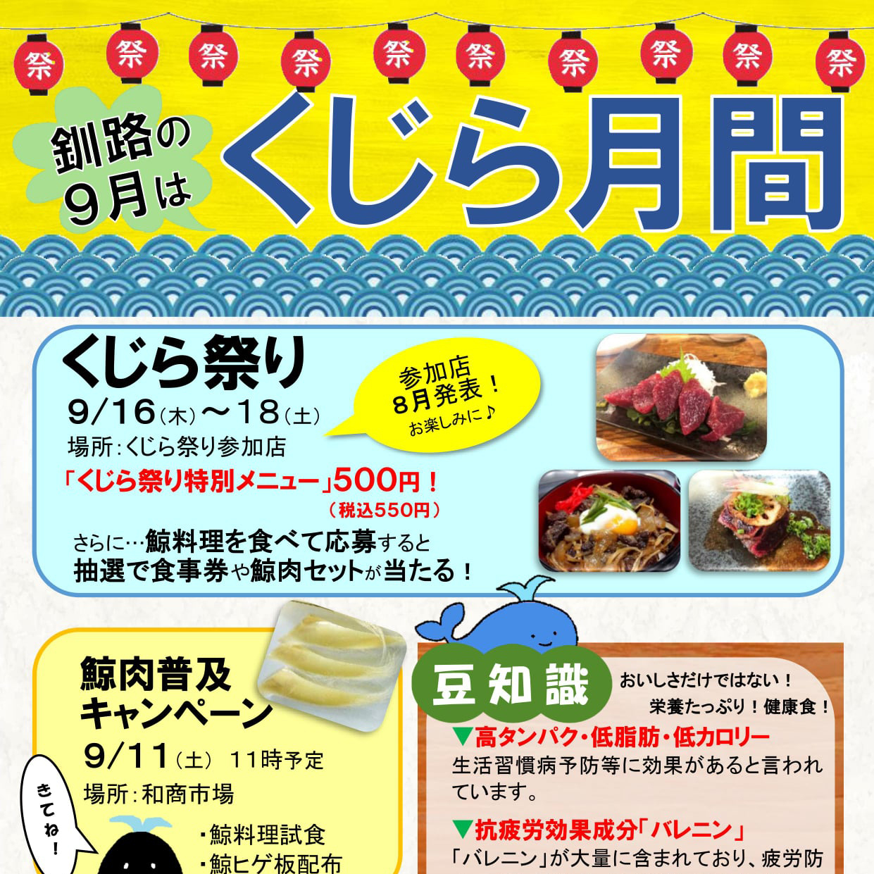 「くじら月間」イベントのお知らせ 2021年度 2022.02.22 2021.07.15 暦では夏本番ですが、釧路では涼しい日が続いていますね。さて、くじら協議会では9月に行われる「くじら月間イベント」の準備を着々と進めております。今年も「釧路の9月はくじら月間」と題して、2つのイベントを予定しております!・9月11日(土)「鯨肉普及キャンペーン」・9月16日(木)~18日(土)「くじら祭り」詳細はまたこちらのページで発表しますので、皆様お楽しみに♪
